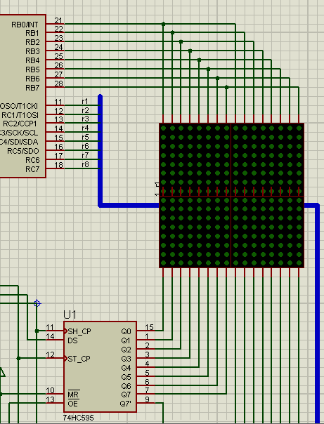(২) নং ছবিতে প্রথম ৮ বিট রো (row) PIC এর PORTB রেজিস্টার এর সাথে সংযোগ এবং নিচের ৮ বিট কলামের(column) 74Hc595 এর সাথে সংযোগ দেখানো হয়েছে।
