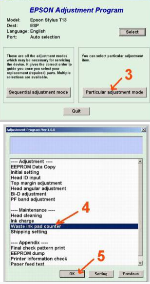 ২য় চিত্রের ৩য় অংশে Particular Adjust Mode এ waste ink pad counter সিলেক্ট করে নিবেন। আর ৩য় চিত্রে Main Pad Counter এবং FL Box Counter এ টিক দিয়ে নিবেন।