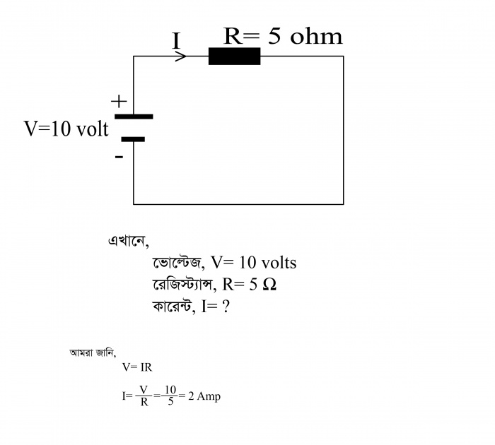 এখানে, V= প্রয়োগকৃত ভোল্টেজ, I= কারেন্ট, R= রোধ বা রেজিস্ট্যান্স।