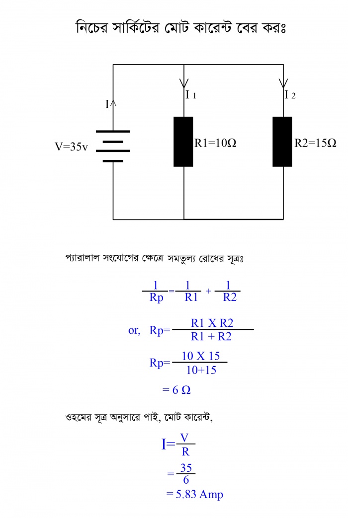 অর্থাৎ চিত্রে প্রদত্ত সার্কিটের মোট কারেন্ট হবে 5.83 এম্পিয়ার।