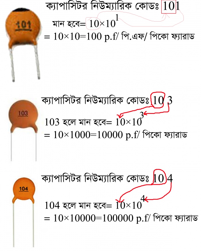 অনেক সময় কিছু ছোট সাইজের ক্যাপাসিটরের গায়ে কিছু কোড যেমনঃ 101, 102, 222, 105 ইত্যাদি দেখা যায়। এগুলো আসলে সিরামিক ক্যাপাসিটর। নম্বর দেখে এসব ক্যাপাসিটরের মান বের করার একটি সূত্র নিয়ে একটু আলোচনা না করলেই নয়ঃ