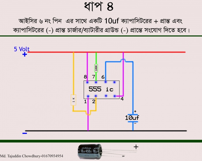 কাজ শেষ। এবার ব্যাটারী বা 5 ভোল্টের চার্জার সংযোগ দিতে হবে। উল্লেখ্য যে, চার্জারের লাল তারটি প্লাস(+) এবং কালো তারটি গ্রাউন্ড বা (-)