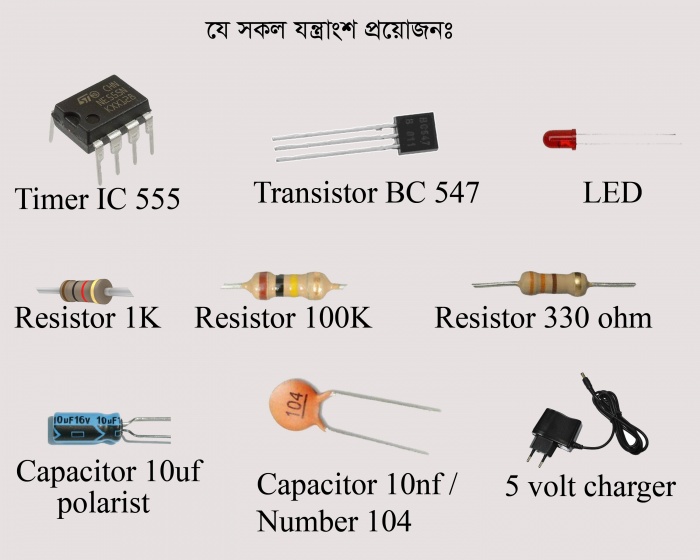 এই যন্ত্র গুলো খুবই সহজলভ্য আপনার নিকটস্থ ইলেকট্রনিক্স দোকানে পাবেন। দাম 30-40 টাকা। 5 ভোল্টের মোবাইল চার্জার দিয়েই সার্কিটটিতে পাওয়ার দেয়া যাবে। তো চলুন শুরু করি। তবে শুরু করার আগে আইসি, ক্যাপাসিটর ও ট্রানজিস্টর এর পিনগুলোর কনফিগারেশন জেনে নেই।