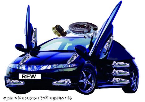 ইঞ্জিনিয়ারিং ওয়ার্কশপের মালিক আমির হোসেন এক অসাধারণ প্রতিভাবান ব্যক্তি। এর আগে তিনি বিভিন্ন যন্ত্রপাতি তৈরি করে দেশজুড়ে আলোচনার কেন্দ্রবিন্দুতে পরিণত হয়েছিলেন। আবারও দেশে ঝড় তুলতে যাচ্ছেন। অল্পদিনের মধ্যে বাতাসচালিত গাড়ি দেশবাসীকে উপহার দিতে পারবেন বলে তিনি জানান। যা রাস্তাতো বটেই আকাশেও উড়তে সক্ষম।