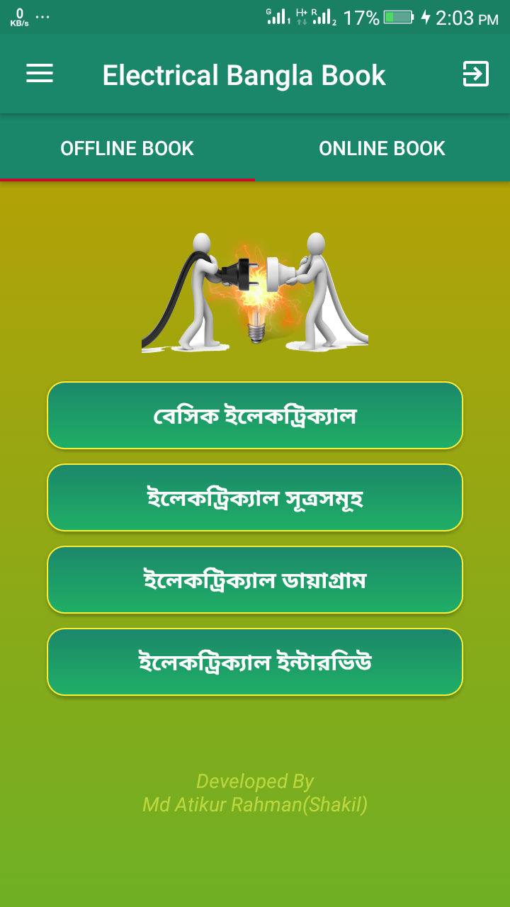 আসসামুআলাইকুম ওয়া রাহমাতুল্লা, আশা করি সবাই ভাল আছেন। আমি আপনাদের সামনে আজকে ইলেকট্রিক্যাল বাংলা একটি অ্যাপস নেয়ে হাজির হলাম, এই ইলেকট্রিক্যাল অ্যাপসটি সম্পর্ন বাংলায় করা হয়েছে, তাই আপনি খুব সহজেই ইলেকট্রিক্যাল কাজ গুলো শিখতে পারবেন আশা করি।