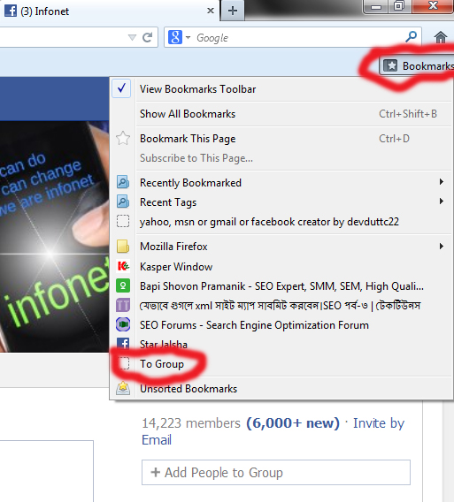 এবার নিচের চিত্রের মত মজিলাফায়ারফক্সের ডানপাশে বুকমার্ক্স নামে একটি বাটন পাবেন। সেখানে “to group” নামে এইমাত্র করা বুকমার্কটি পাবেন। নিচের চিত্র দেখুন।