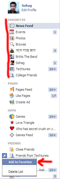 ছবিতে দেখুন আমি আমার দরকারি পেজ, গ্রুপ এবং ফ্রেন্ড লিস্ট উপরে নিয়ে গেছি। যেকোনো পেজ, গ্রুপ বা ফ্রেন্ড লিস্টের বাম পাশে মাউস আনলেই এডিট বাটন পাবেন সেখানে ক্লিক করে Add to Favorites এ ক্লিক করলেই উপরে চলে যাবে।