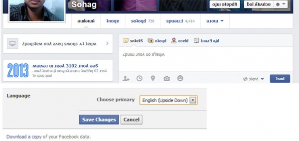 কাজটা করা অনেক সহজ, কেউ হয়তো চিন্তাও করেন নাই যে ফেসবুকও আমাদের সাথে মজা করে :P। Account Setting থেকে Language এ English (Upside Down) সিলেক্ট করে দিন। এবার দেখুন মজা।