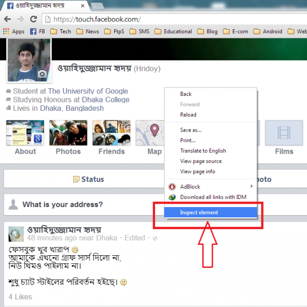 লগিন করার পর পেজের উপর মাউসের রাইট বাটন ক্লিক করে নিচ থেকে "Inspect element" এ ক্লিক করুন।