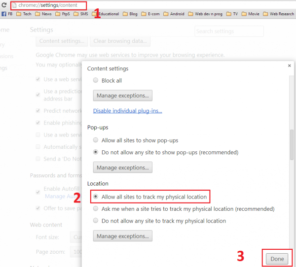 address বারে লিখুন chrome://settings/content এবং enter প্রেস করুন এবার content setting>location থেকে "Allow all site to track my physical location" সিলেক্ট করে "Done" দিয়ে বেরিয়ে আসুন।