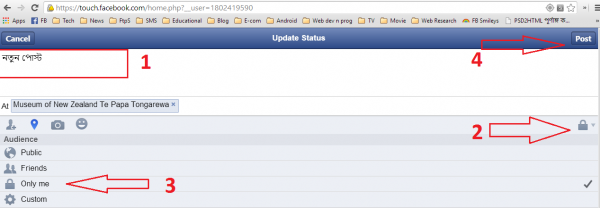 এবার পোষ্ট প্রাইভেসি পরিবর্তন করে "only me" দিয়ে একটা পোষ্ট করুন। (প্রাইভেসি পরিবর্তন না করলেও হবে)
