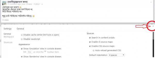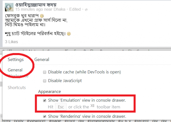 তাহলে নিচের মত আসবে। এখন "setting>General>Appearance" এর "Show 'emulation view in console drawer" এ টিক দিন। (চিত্রে দেখুন)