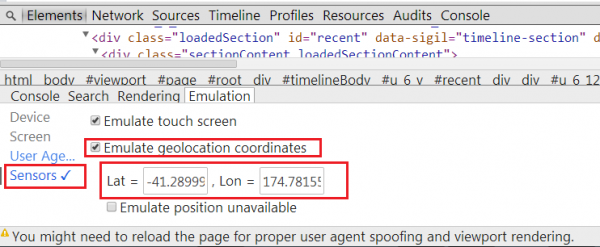এবার "Sensons" থেকে "Emulate geolocation coordinates" এ টিক দিন এবং Lat= -41.289996 , Lon= 174.781555 দিন।