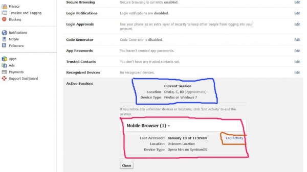 পোষ্টটি কার কাছে কেমন লাগে আমি জানিনা। তবে আমার কাছে মনে হয় পোষ্টটি খুবই গুরুত্বপূর্ণ। অন্তত যারা এই জিনিসটি জানেন না তাদের জন্যতো অবশ্যই। এটি কিন্তু ফেজবুকের সিকিউরিটি নিয়ে একটি পোষ্ট। অনেক সময় সাইবার ক্যাপে বা বন্ধুর পিসিতে ফেজবুক লগইন করে থাকেন কিন্তু কোন কারণে লগ-আউট করতে ভুলে গেলেন, তখন কি করবেন?? কি সাইবার ক্যাপে যাবেন? আবার বন্ধুর বাসায় যাবেন লগ আউট করতে? না ভয় পাবেন না । আপনি আপনার পিসি থেকেই লগআউট করে ফেলতে পারবেন। তার জন্য নিচের ধাপ অনুস্বরণ করুন।