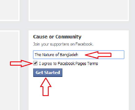 তারপর নিচের ছবির মতো অপশন আসবে। সেখানে আপনার পেজের নাম দিন এবং নিচের I agree Facebook Pages Terms এ টিক চিহ্ন দিন। তারপর Get Started এ ক্লিক করুন।