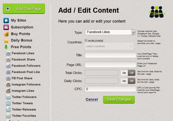 অ্যাড মি ফাস্ট ওয়েব সাইটে গেলেই দেখতে পাবেন add site/page নামে একটি অপশন আছে। ঐখানে ক্লিক করলে উপরের ন্যায় একটি বক্স পাবেন। সেখানে আপনার পেজ/ফটো/টিউনের লিংক এবং একটি নেম ও সিপিসি মানে পার লাইকে কত পয়েন্ট দিবেন সেটা সেট করে সেভ করলেই ওকে। মূলত এই পদ্ধতি অবলম্বন করেই মানুষ লাইকের ব্যবসা করছে। কেউবা ৫০০ লাইক সেল করছে ৫ ডলারে ফাইভার.কমে। ফ্রিতে লাইক পাওয়ার এই দুটি পদ্ধতিই আমি জানি। তাছাড়া আমার আর সৎ কোন পদ্ধতি আমার জানা নাই।