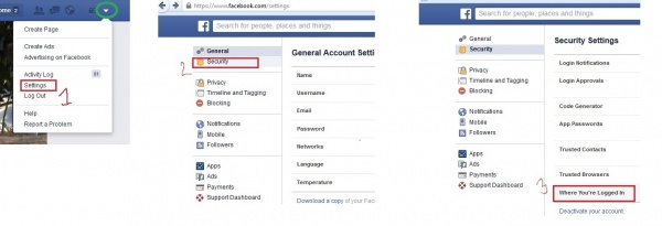 আপনার মোবাইল ফোন বা অন্য কোন পিসি/ল্যাপটপ থেকে ফেসবুক এ লগ ইন করেন। তারপর নিচের চিত্রের মত প্রথমে Setting, এরপর Security অবশেষে Where You're Logged In এ ক্লিক করুন।