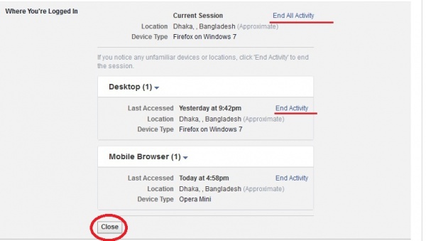 এখন আপনি দেখতে পাবেন আপনি কোন কোন ডিভাইস থেকে লগ ইন অবস্থায় আছেন। এর মধ্যে কিছুক্ষন পূর্বে ব্যবহার করা সেই পিসি/ ল্যাপটপ/ মোবাইল ফোন টি ও রয়েছে, ব্যবহার করার সময় ও উল্লেখ করা আছে। এখন আপনি ওই ডিভাইস টি End Activity ক্লিক করে লগ আউট করতে পারেন। ইচ্ছে করলে আপনি End All Activity ক্লিক করে সব ডিভাইস থেকে একেবারে লগ আউট করতে পারেন। এবার Close ক্লিক করে বের হয়ে আসুন।