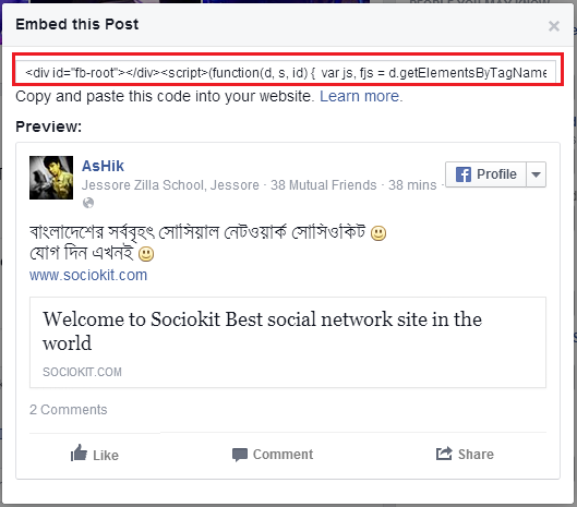 লাল মার্ক করা আংশটুকু ক্লিক করে কপি করুন। এবার আপনি যেখানে পোস্টটি এম্বেলডেড করবেন সেখানে পেস্ট করুন। ব্যাস হয়ে গেল। 🙂