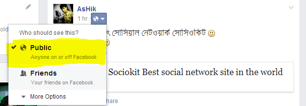 পোস্ট এম্বেলডেড হল আপনার যে কোন পোস্ট HTML এর মাধ্যমে কোন সাইট/ ব্লগ এ শেয়ার করা। যেমনটি আমরা ইউটিউবে দেখি। ইউটিউবের যেকোন ভিডিও এম্বেলডেড করে যেকোন সাইটে শেয়ার করা যায়। ফেসবুকে যে পোস্ট এম্বেলডেড করা যায় তা অনেকেই জানি না। তবে মনে রাখবেন যে পোস্ট এম্বেলডেড করবেন সেটি অবশ্যই পাবলিক মুডে থাকতে হবে। পাবলিক মুডে কি তা না জানলে নিচের scrnshoot টি দেখুন ।