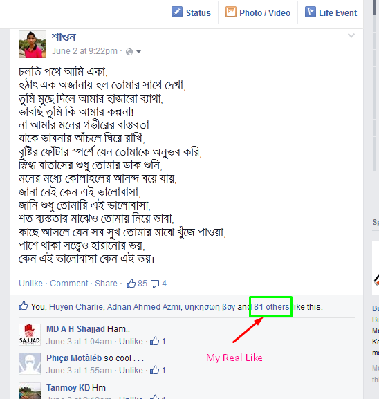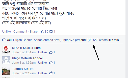 আজ আমি আপনাদের সাথে যেই টিপস টি শেয়ার করবো তার মাধ্যমে আপনি আপনার ফেসবুক এর স্ট্যাটাস কিংবা ফটোতে ইচ্ছামত লাইক বসিয়ে বন্ধুদের সাথে মজা নিতে পারবেন। বিশ্বাস নাহলে নিচের ফটোটা দেখুন।