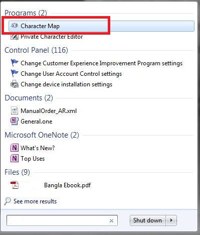 এজন্য প্রথমে আপনাকে কম্পিউটারের start menu থেকে search menu এর সাহায্যে Character Map খুঁজে বের করতে হবে।