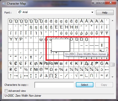 তারপরে Charcter Map এ গিয়ে সিলেক্ট করুন U+200C:Zero widhth Non-Joiner তারপরে select button press করে কপি করুন আর paste করে দিন আপনার ফেসবুকের স্ট্যাটাস বক্সে, তারপরে স্ট্যাটাসটি post করে দেখুন মজা !