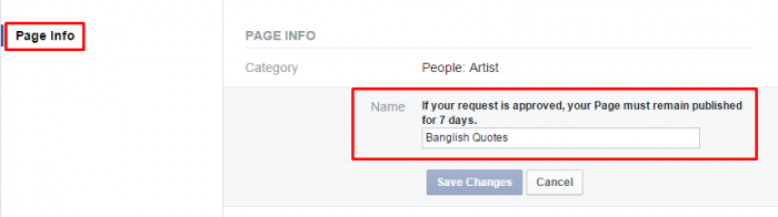 ৩।তারপর বক্সে নতুন নাম দিয়ে "Save Changes " দিন... দেখুন আপনার পেজের নাম পরিবর্তন হয়ে গেছে 😀 পেজ টা 2/1 বার রিলোড মারেন দেখবেন আপনার পেজটির নাম পরিবর্তন হয়ে গেছে! এইভাবে আপনি ২০০ লাইক হওয়ার পর ও আপনার ফেসবুক পেজের নাম পরিবর্তন করতে পারবেন খুব সহজেই !