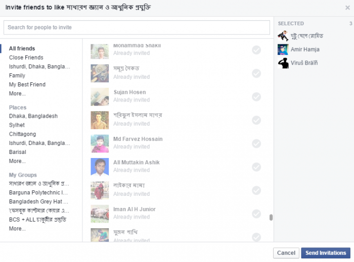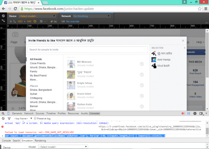 বর্তমান facebook user সংখ্যা ব্যাপক। কেউ আর কিছু বুঝুক আর না বুঝুক ইন্টারনেট মানে facebook এই কথাটা বোঝে। Lol। তাই আর কিছু প্রয়োজনে মানুষের facebook page খোলাটা নিত্যনতুন ব্যাপার। সেইটা personal page হোক আর organization বা public page। কিন্তু পেজ খোলার পর like নিয়ে পড়েন বিপাকে। যাদের friend কম তারাও ঝামালেই পড়েন। আর যাদের friend বেশি তাদের ঝামেলা আরও বেশি। একবার একবার করে invite এ click করতে করতে মাথার চাদি হাওয়া হয়ে যায়। অনেকে হয়ত invite করার জন্য google chorme/mozzila firefox extradition ব্যবহার করেন। কিন্তু অন্য pc তে বসলে আবার google search করে খুঁজে বের করতে অনেক ঝামেলা হয়। তাই আজকে আমি একটি java script দিচ্ছি যেইটা নিজের facebook note এ copy করে রাখুন। যখন তখন পাওয়ার জন্য। প্রথমে facebook ধরুন। তারপর আপনার পেজে যান এবং invite friend এ click করুন। আপনার friendlist ওপর থেকে নিচে নামান। যত নিচে নামাবেন তত friend show করবে। এইভাবে সব friend দের শো করানোর পর (অবশ্যয় google chorme ব্যবহার করতে হবে) keyboard এ ctrl+shif+i চাপুন এবার console এ ক্লিক করুন। তারপর এই code টি পেস্ট করে দিন এবং enter দিন। কাজ শেষ। এইবার দেখবেন পেজে invited people দের লাইক পড়ছে।