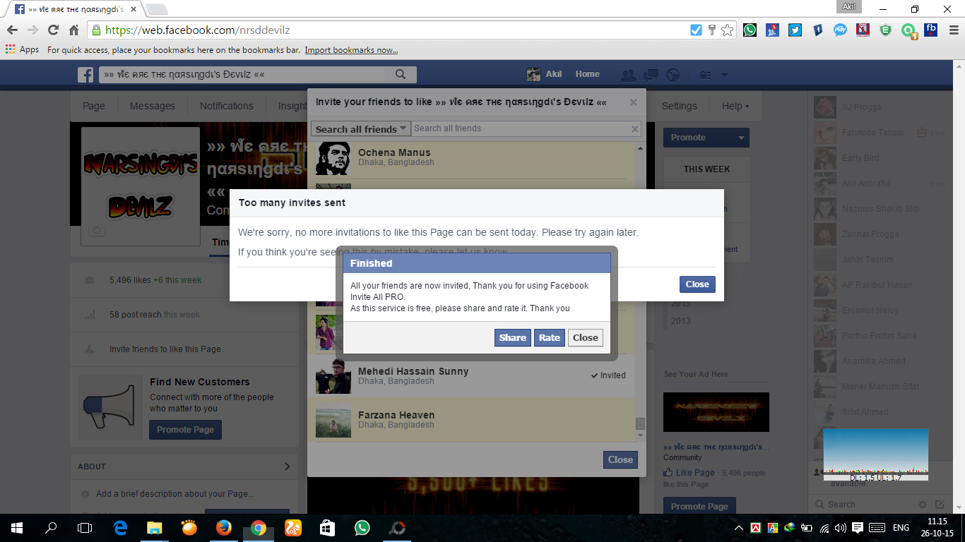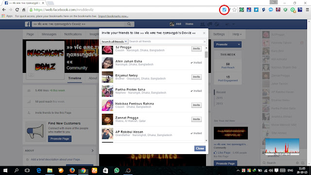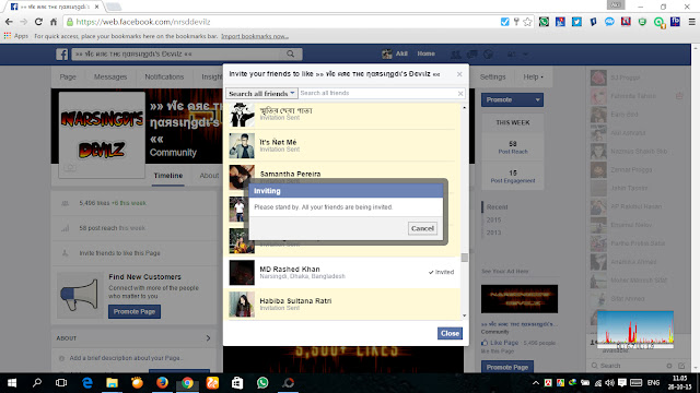 সবাই কেমন আছেন। এটা টেকটিউনস এ আমার ৭ম টিউন। আমাদের প্রায় সকলএরই ফেসবুকে একাউন্ট আছে। বর্তমান সময়ে ফেসবুক ব্যবহার করে না এমন মানুষ খুঁজে পাওয়া অনেক মুশকিল ব্যাপার। আমাদের মধ্যে অনেকেই আছে যারা দিনের বেশিরভাগ সময়টাই ফেসবুকে ব্যয় করি। আর বলতে গেলে প্রায় সবারই একাধিক আইডি আছে। ফেসবুক পেজও আছে। যাদের পেজ আছে তাদের নিশ্চই জানা আছে যে ফেসবুক পেজ এ একজন একজন করে ইনভাইট করা কত বিরক্তিকর। আমি যখন প্রথম পেজ খুলি তখন ফেসবুকে ইনভাইট করতে করতেই বিরক্ত হয়ে যেতাম। এরপরে পেজ চালানোই বাদ দিয়ে দেই। কারন পেজে ফ্যান না থাকলে পেজ চালায় মজা নাই। তাহলে আর বেশি কিছু বলছি না। সরাসরি আসল কথায় আসি। কিভাবে আপনি এক ক্লিকে আপনার পেজে সকল ফ্রেন্ডসদের ইনভাইট করবেন ?