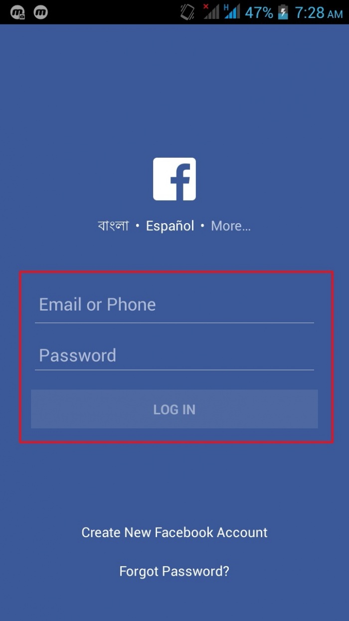 প্রথমে আপনাকে আপনার ফোনের গুগল প্লে স্টোর থেকে ফেসবুক অ্যাপটি ইনস্টল করতে হবে। আপনার ফোনে ইনস্টল করার পর আপনার ফেসবুকের মেইল আইডি ও পাসোয়ার্ড দিয়ে লগ ইন করুন চিত্রে দেখুনঃ