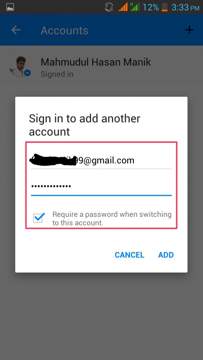 ক্লিক করার পর আপনি অন্য যে একাউন্ট টি লগইন করবেন সেই একাউন্ট এর ইমেইল পাসওয়ার্ড দিয়ে Add বাটনে ক্লিক করুন দেখুন নিচের চিত্রে