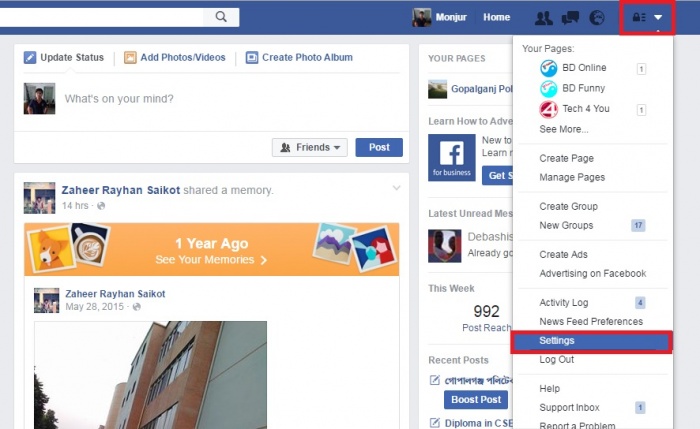 প্রথমে ফেসবুকে লগিন করার পর ডানপাশের কর্নার থেকে সেটিং এ যেতে হবে।