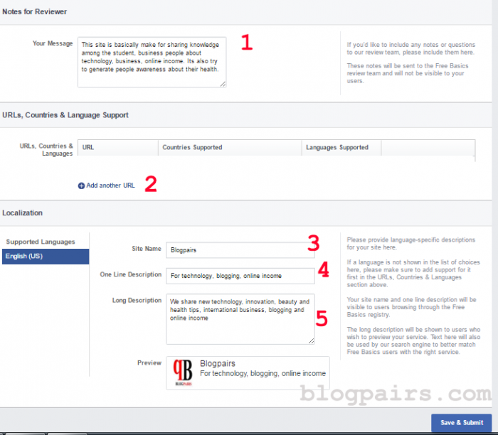 এর পর প্রথম ঘরে সাইট নিয়ে ফেসবুক রিভিও টিমের কাছে যদি কোন রিকুয়েস্ট থাকে লিখবেন। এবার ২ য় ঘরে আপনার ওয়েবসাইট যোগ করুন। সেখানে কোন কোন দেশের ভাষা সাপোর্ট করবে সেটা ক্লিক করুন। আর আপনার সাইট মোবাইল ভিও সাপোর্ট করবে কিনা টেস্ট করতে পারবেন। এবার তৃতীয় ঘরে আবার সাইটের নাম দিন। চতুর্থ ঘরে সংক্ষিপ্ত এবং পঞ্চম ঘরে বিস্তারিত বিবরন দিন।