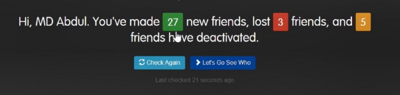 তাহলে নিচের মত এরকম পেজ আসবে যেখানে দেয়া থাকবে নতুন কে কে ফ্রেন্ড যুক্ত হল, কে কে তাদের আইডি ডিয়্যাক্টিভেট করেছে কিংবা আপনি কতজন বন্ধু হারিয়েছেন ইত্যাদি। তো লেট'স গো সি হু'তে ক্লিক করে চলুন দেখি কি আসে।
