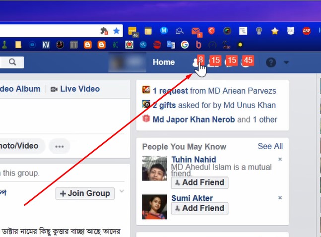 নিচের আমার ফেসবুকের স্ক্রিনশর্ট দেখতে পাচ্ছেন। এতে নটিফিকেশন, ম্যাসেজ ও ফ্রেন্ড রিকুয়েস্ট ছাড়াও অতিরিক্ত আরেকটা আইকোন দেখা আচ্ছে যেদি দিয়ে আপনি উক্ত অসাধ্য সাধন করতে পারবেন। 😆 তো সেখানে ক্লিক করছি,