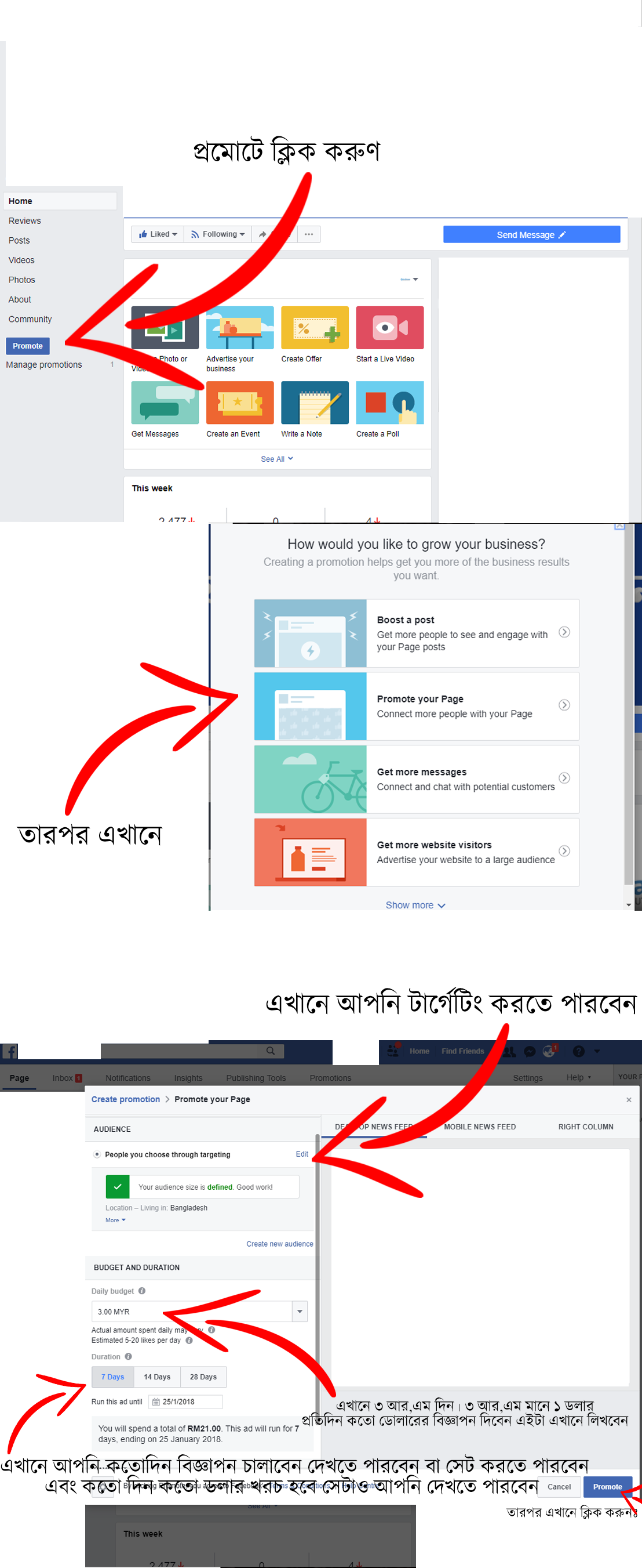 তাহলে চলুন দেখে নেই কিভাবে ফেসবুক পেইজ প্রমোট করবেন। প্রথমেই আপনি আপনার ফেসবুজ পেযে চলে যাবেন বাকিটা নিচে ছবি আকারে দেওয়া হলোঃ