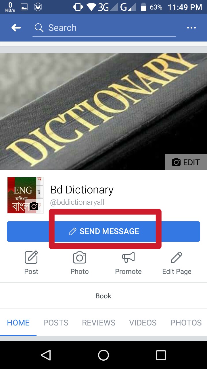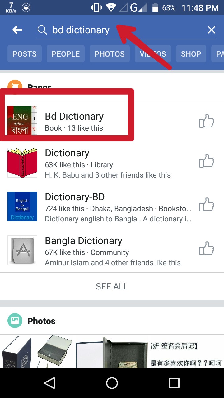 ১.প্রথমে আপনার ফেসবুক থেকে সার্চ দিন Bd dictionary লিখে। তারপর প্রথম যে পেজটি আসবে সেটির মধ্যে প্রবেশ করুন। পেজ লিংক