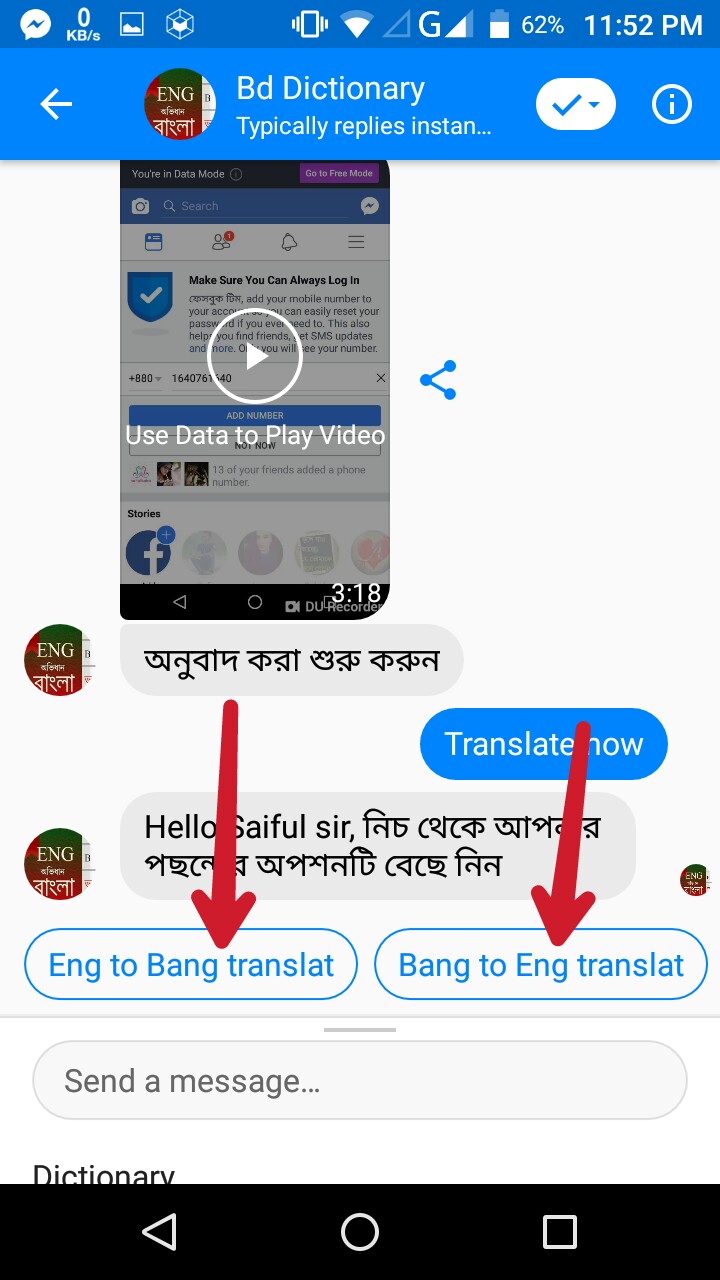 আজকের দিনে ফেসবুক ম্যাসেন্জারের মধ্যে অটোমেটিক ম্যসেজ রিপ্লাই দেয়া একটি অসাধারন ফিচার। এই ফিচারটি হয়ত আমরা সবাই ভোগ করেছি এবং এর নাম ও আমরা জানি messenger bot. বিভিন্ন বড় বড় কম্পানি তাদের কাষ্টমারদের সহজেই সেবা প্রদান করার জন্য অটোবট সিস্টেম টি ব্যবহার করে থাকেন। এমনকি এই বট ইউজ করে আজকাল মোটামোটি সব কাজই করা যায়। যায়হোক আজকে আমিও আপনাদের এমনই একটি বট এর সাথে পরিচয় করিয়ে দিব। আর সেই বট টির কাজ হচ্ছে বাংলাকে ইংলিশে এবং ইংলিশকে বাংলায় রুপান্তর করা। অর্থাৎ এক কথায় দাড়ায় বটটি হল translator বট। খুব সহজেই বটটি আপনি ম্যাসেন্জার ইউজ করে ব্যবহার করতে পারবেন। বটটি launch করেছে বেশি দিন হয় নি। চলুন দেখে নেয় কি ভাবে বট টি ব্যবহার করতে হয়।