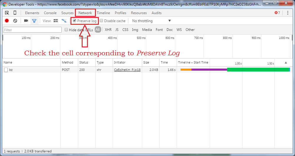 ২) এবার Developer Tools উইন্ডোর মেন্যুবারে লক্ষ্য করুন, মেন্যুবারে Network অপশনটি পাবেন, এখানে ক্লিক করুন। নেটওর্য়াক অপশনে ক্লিক করার পর এর নিচে দেখবেন Preserve log নামের একটি চেক বক্স রয়েছে, এটায় টিক চিহ্ন দিয়ে দিন।
