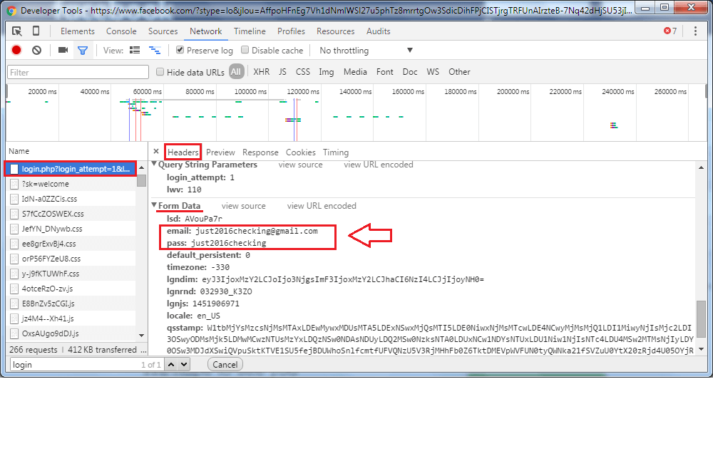 ৮) login.php এন্ট্রিতে ক্লিক করার পর ডান পাশে এটি ওপেন হবে। এবং আপনি Headers, Preview, Response, Cookies এবং Timing নামের চারটি ট্যাব পাবেন। এখান থেকে হেডারস ট্যাবে ক্লিক করুন। নিচের দিকে স্ক্রল ডাউন করে যান, যেতে যেতে দেখবেন From Data নামের একটি সেকশন পাবেন, এই সেকশনের থেকে আরেকটু স্ক্রল ডাউন করে নিচের দিকে গেলেই দুটি এন্ট্রি আপনি দেখতে পাবেন email এবং pass নামের। এখানেই আপনি আপনার বন্ধুর ফেসবুক একাউন্ট লগইন করার সময় ব্যবহৃত ইমেইল / ফোন নাম্বার এবং তার পাসওর্য়াডটি পেয়ে যাবেন একদম পিউর প্লেইন টেক্সটে! (pure plain text)