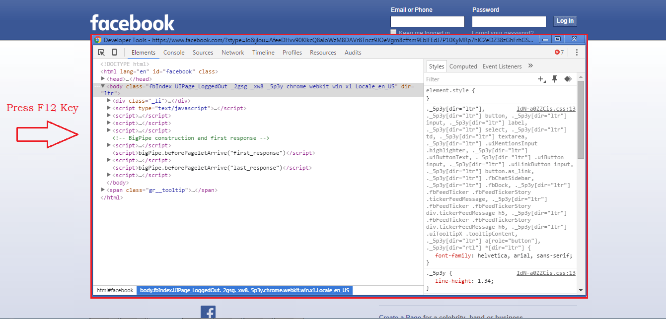 ১) পিসি থেকে ব্রাউজার ওপেন করুন। লক্ষ্য রাখবেন যে ব্রাউজারটি দিয়ে বন্ধুটিকে ফেসবুকে লগইন করতে দিবেন ওই ব্রাউজারটিই চালু করবেন। ব্রাউজার ওপেন করে ফেসবুক সাইটে যান। আপনার একাউন্ট লগইন করা থাকলে লগআউট হন। এবার কিবোর্ডের F12 কী চাপুন। এতে ব্রাউজারের Developer Tools উইন্ডোজটি চালু হবে।