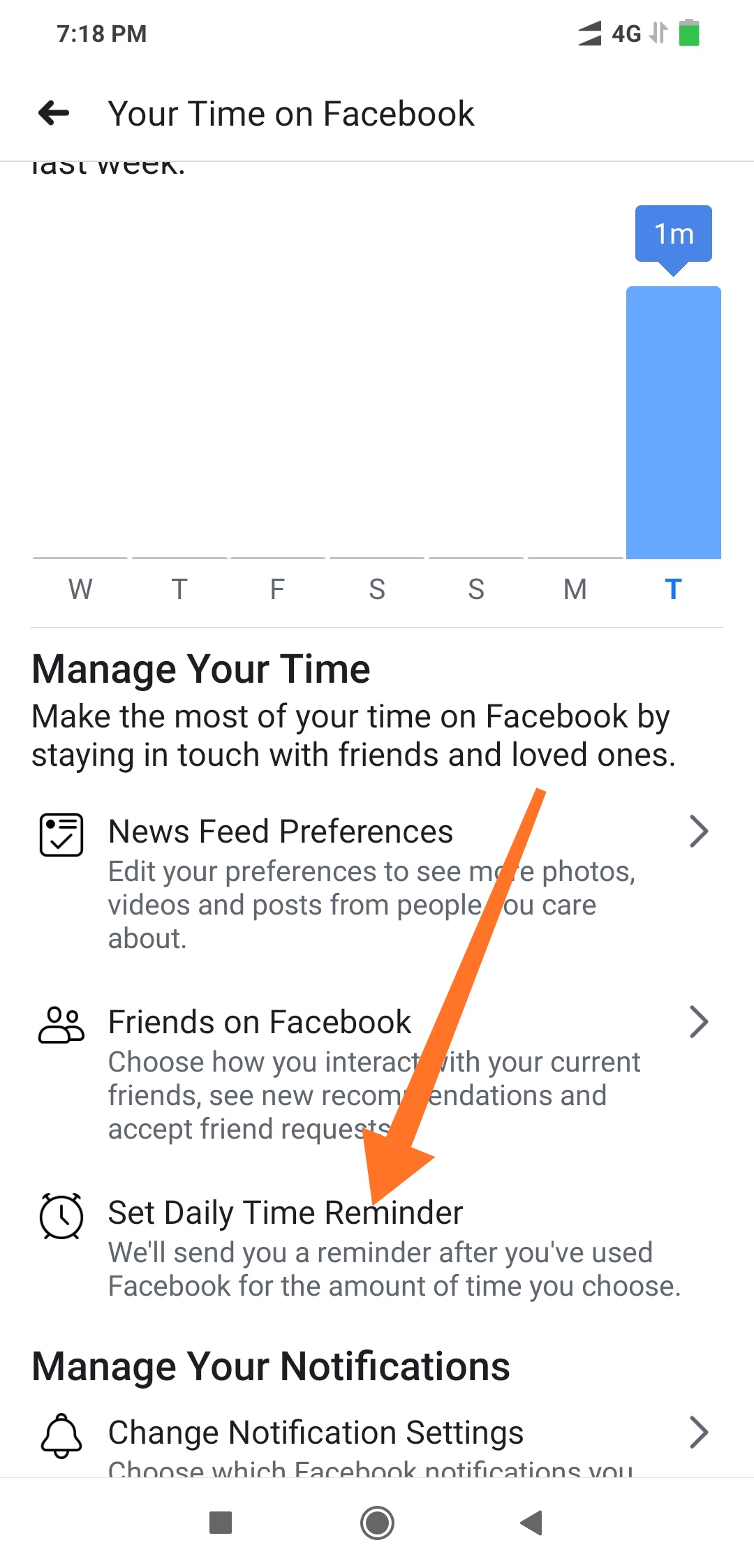 এখানে আপনি একটি বার দেখতে পাবেন, যেটি গত এক সপ্তাহে আপনি কত মিনিট আপনি ফেসবুকে ব্যয় করেছেন, তা দেখতে পারেন। এই মোবাইল অ্যাপে আপনি ফেসবুকে প্রতিদিনের ব্যয়িত সময়ও নির্ধারণ করে দিতে পারেন।