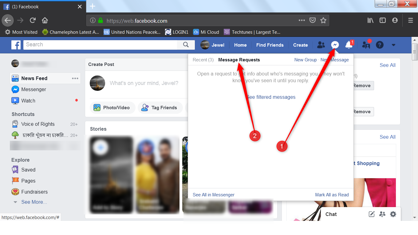 ফেসবুকে Message Request কোথায় আছে, তা কি আপনি জানেন। অনেক সময় আপনার ফেন্ড ছাড়াও আমাদের ফেসবুক কিংবা ম্যাসেঞ্জারে অনেকে ম্যাসেজ দেয়। কিন্তু আমরা অনেকে তা খুঁজে পাই না। এই রকম ম্যাসেজ দেখার জন্য ফেসবুকের ম্যাসেঞ্জার আইকন এর উপর ক্লিক করুন। তারপর Inbox এর Recent ট্যাবে ক্লিক করে ম্যাসেজগুলো দেখতে পারেন।