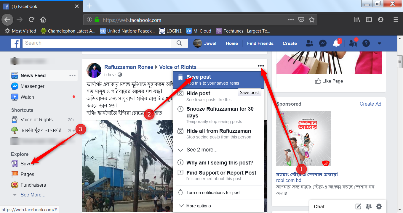 ফেসবুকের News Feed গুলো খুব তারাতারি আপডেট নেয়। ফেসবুকের অলদারিগমই হচ্ছে এটা। এজন্য আপনার পছন্দের টিউন/লিংক/ভিডিও খুব তারাতারি News Feed হতে হারিয়ে যায়। সেই টিউন/লিংক/ভিডিও পরে দেখার জন্য আপনি সেভ করে রাখতে পারেন।