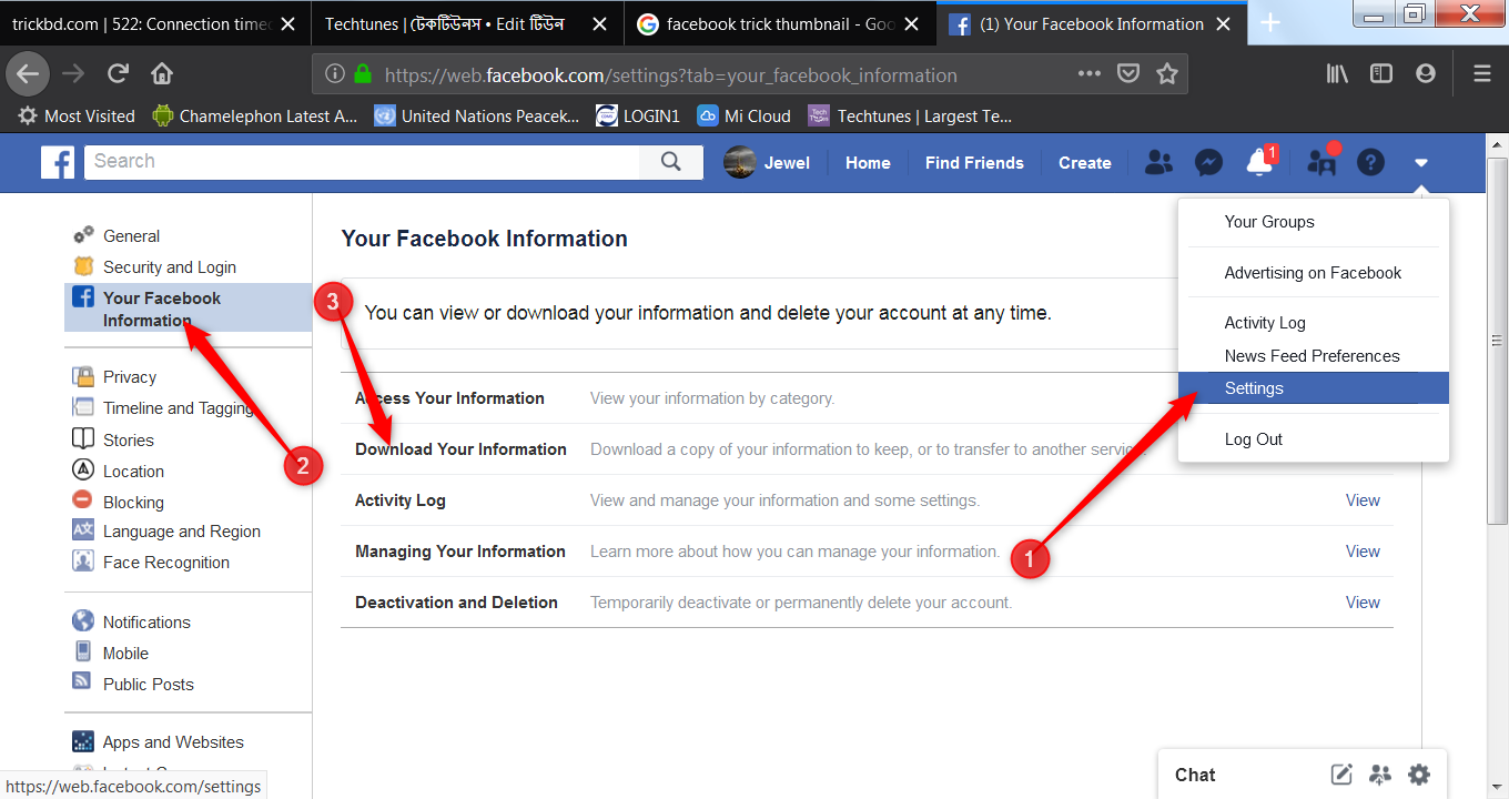 আপনি কি আপনার সমস্ত ফেসবুকিং কার্যক্রম এর কপি ডাউনলোড করতে চান। আমি বলছি আপনার সমস্ত কিছু টিউন, ইমেজ, ভিডিও, ম্যাসেজ সব কিছুই আপনি ডাউনলোড করতে পারেন। এজন্য আপনাকে Settings>Your Facebook Information> Click Download Your Information যেতে হবে। তারপর ইনষ্টাকশনগেুলো ফলো করুন।