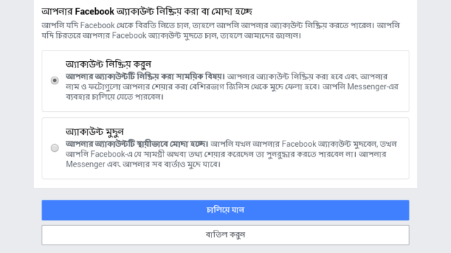 ১. প্রেস করে চালিয়ে গেলে আপনার একাউন্টটি সাময়িক সময়ের জন্য ডিজেবল হয়ে যাবে। কিন্তু পরে লগইন করতে পারবেন। দ্বিতীয় অপশনে ক্লিক করলে ১৪ দিন পর একাউন্ট আর পাবেন না পার্মানেন্ট ভাবে ডিলিট হবে।