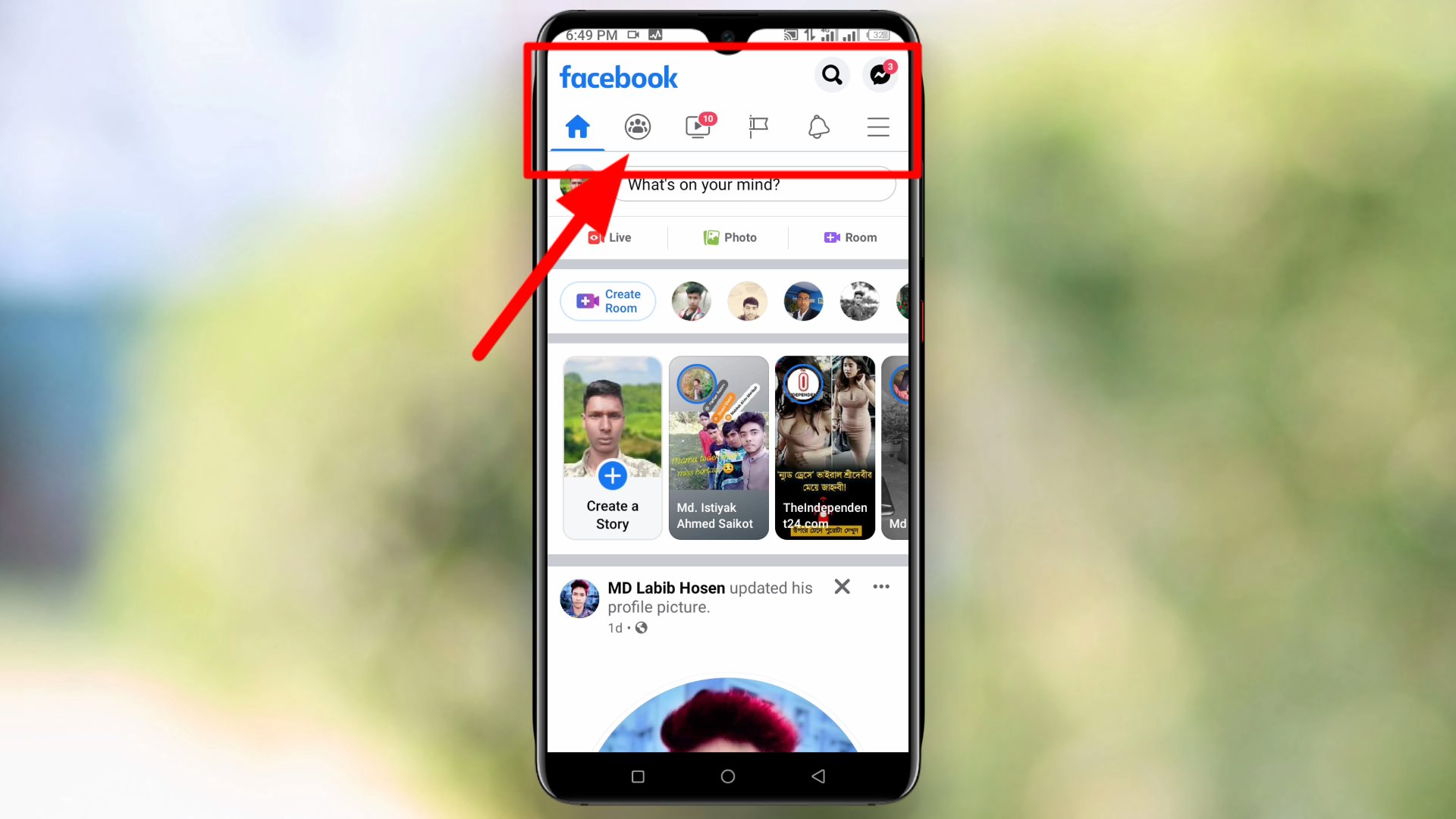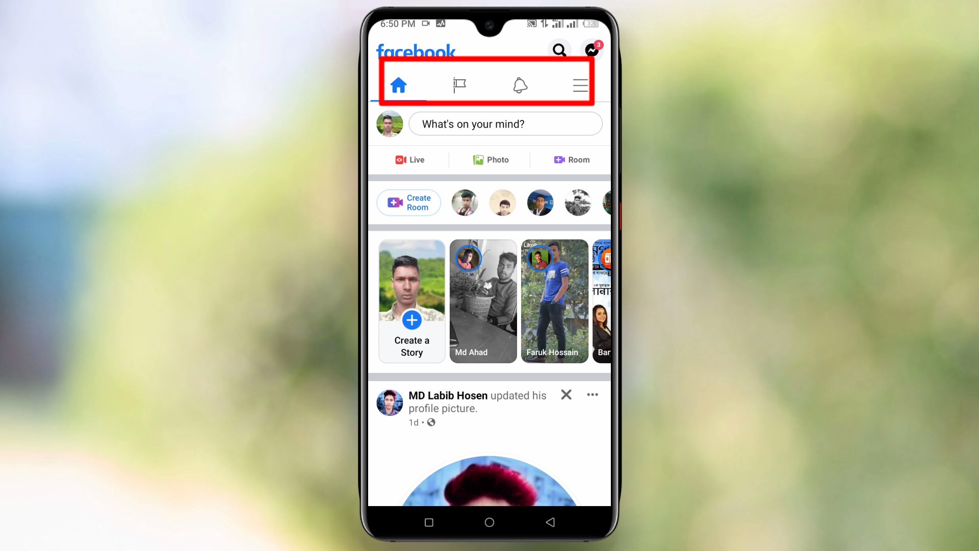 ১. এ জন্য আপনাকে প্রথমে ফেসবুক অ্যাপ এ লগইন করতে হবে। এবার আপনি আপনার ফেসবুক অ্যাপ এর ওপরে লক্ষ্য করুন। আপনি এখানে দেখতে পাচ্ছেন home, groups, videos, notifications এবং menu বাটন। আজকে মূলত আমি আপনাদেরকে এসব বাটন hide করার প্রক্রিয়া দেখাবো।