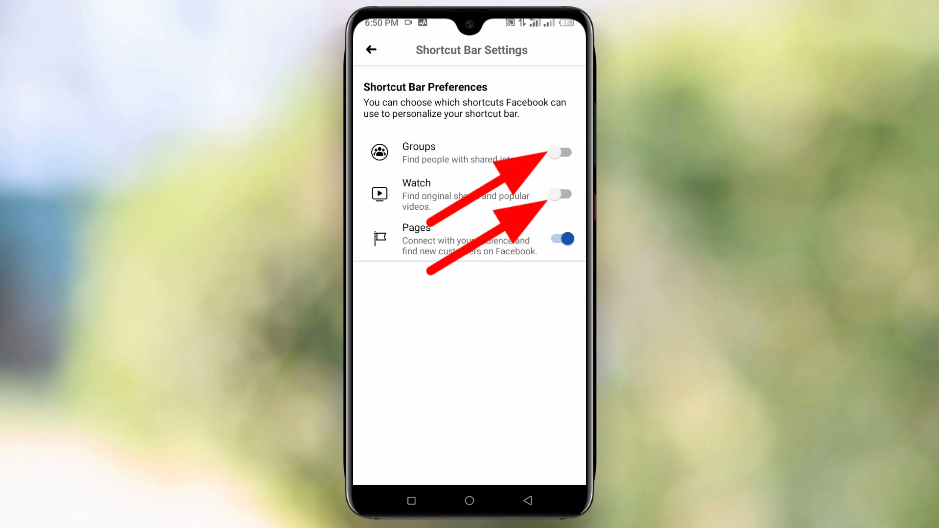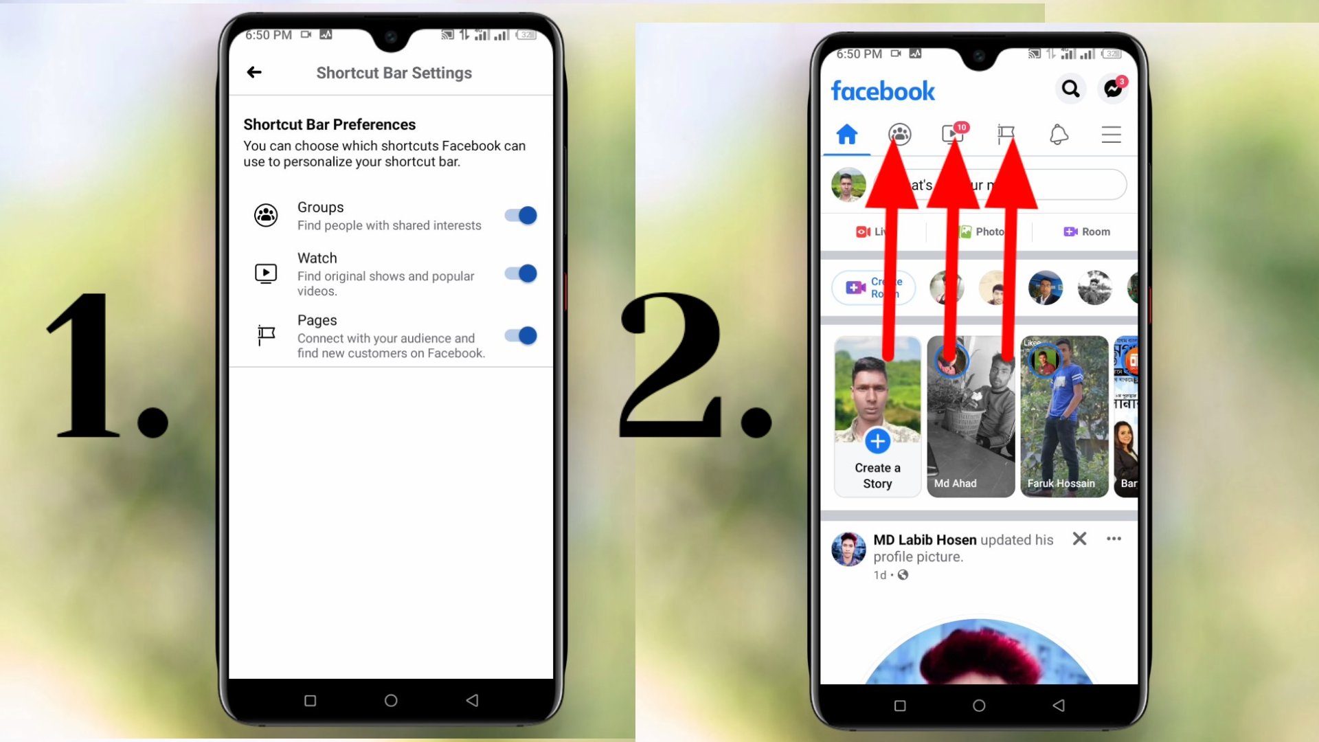 ৪. এবার আপনাকে শর্টকাট বারগুলো হাইড করার নিচের মত এরকম সেটিং এ নিয়ে আসবে। আপনি এখানে তিনটি বিষয়ে hide করার অপশন পাবেন। সেগুলো হলো, groups, watch এবং pages। এগুলো দ্বিতীয় ইমেজের মত আপনার অ্যাপের ওপরে প্রদর্শিত হয়। আপনি এখান থেকে হোম বাটন এবং নোটিফিকেশন বাটন hide করতে পারবেন না। শুধুমাত্র এ তিনটি বিষয়ই এখান থেকে হাইড করে রাখতে পারবেন।