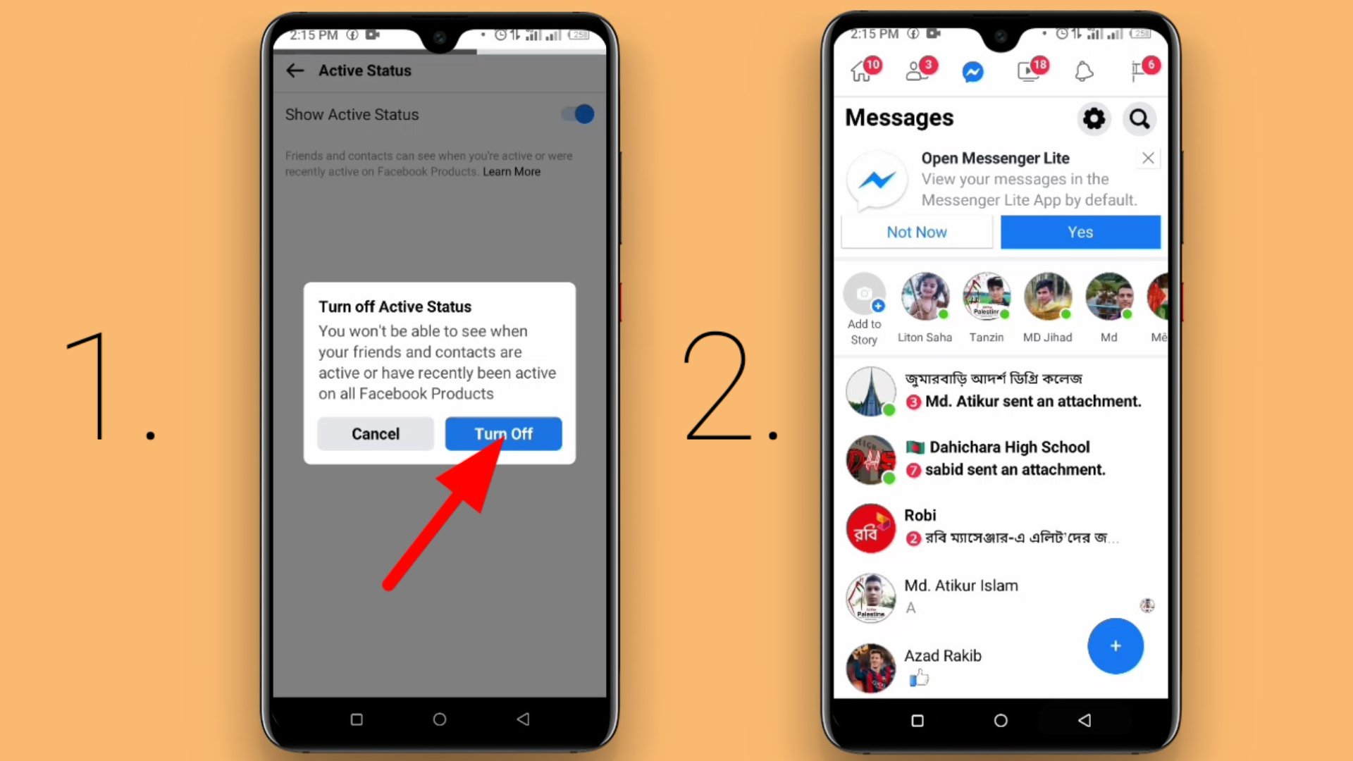 আপনি এখান থেকে Active status বন্ধ করার পরেও অন্যান্য বন্ধুদের কে অ্যাক্টিভ হিসেবে দেখতে পারবেন। এক্ষেত্রে বর্তমানে যেসব বন্ধুরা ফেসবুকে অ্যাক্টিভ রয়েছে বা তাদের মোবাইলের ইন্টারনেট কানেকশন চালু রয়েছে আপনি তাদেরকে এখানে দেখতে পারবেন। এক্ষেত্রে আপনার বন্ধুরা তাদের ফেসবুক মেসেঞ্জারে এরকম ভাবে দেখতে পারবেনা, যদি আপনি আপনার অ্যাক্টিভ স্ট্যাটাস বন্ধ করে রাখেন। এক্ষেত্রে আপনার যখন কোন বন্ধুর সাথে যোগাযোগ করার প্রয়োজন পড়বে তখন Facebook lite অ্যাপটিতে এসে আপনি সেসময়ের অ্যাক্টিভ বন্ধুদেরকে দেখতে পারেন এবং তাদেরকে প্রয়োজন অনুযায়ী মেসেজ করতে পারেন। কিন্তু এক্ষেত্রে তারা সেখান থেকে আপনাকে ইন্যাক্টিভ হিসেবেই দেখবে।